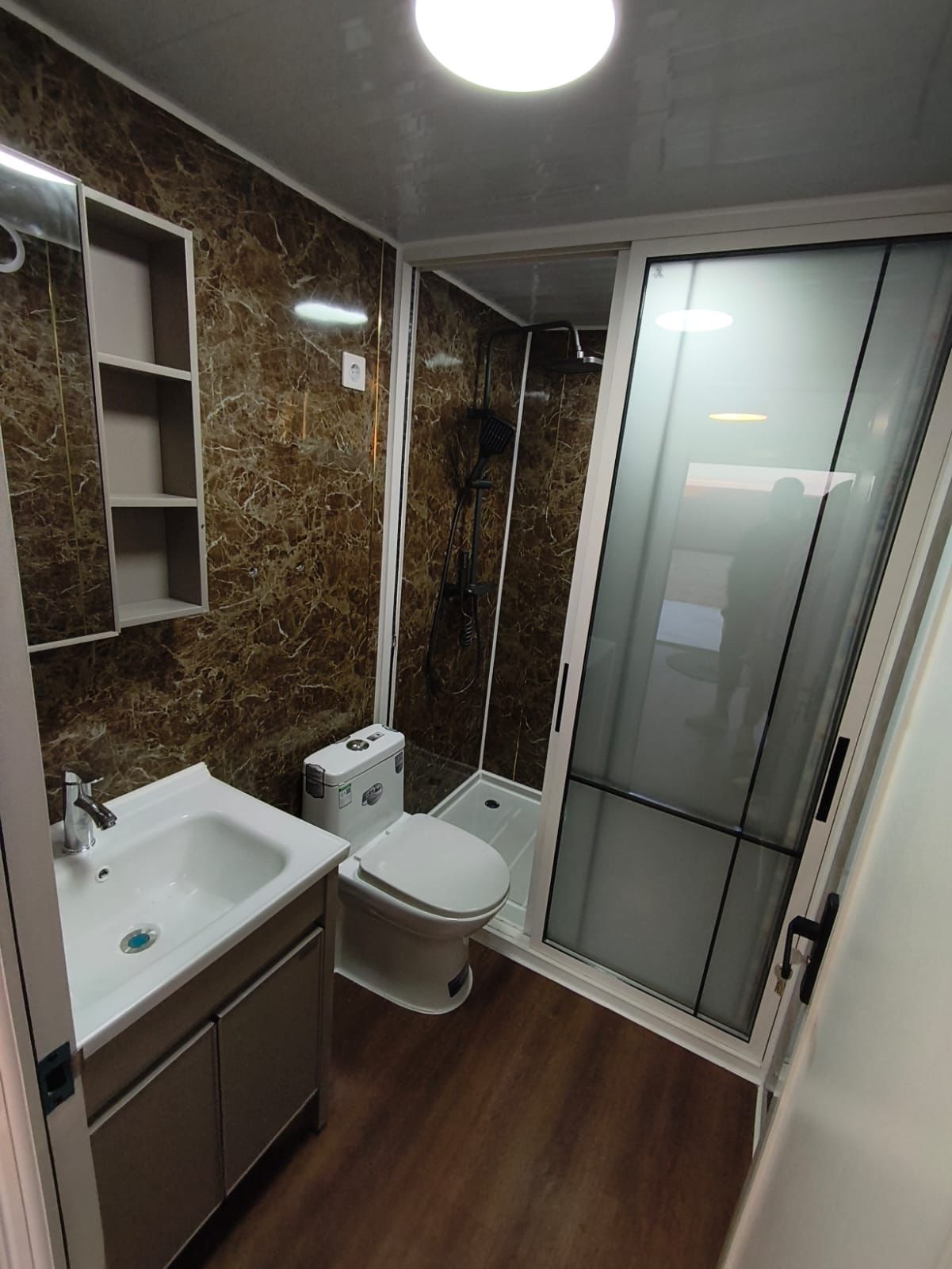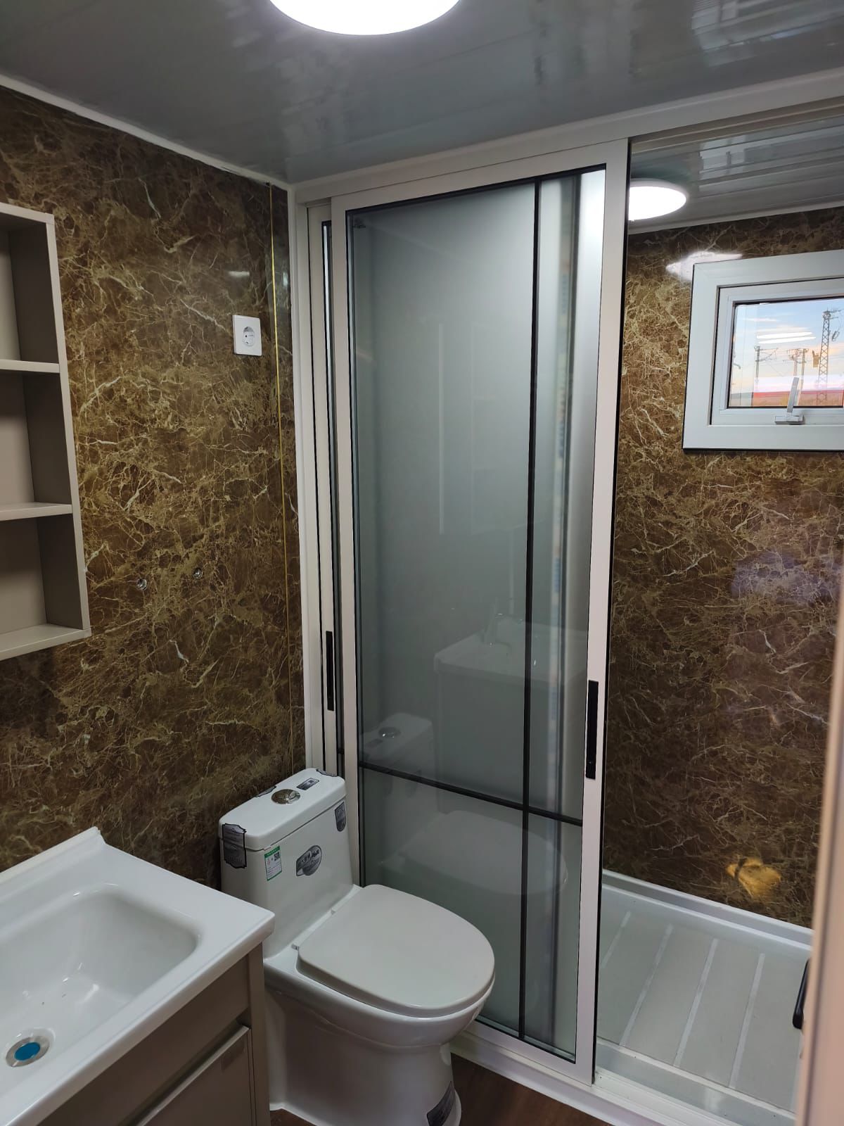 Lavabo completo con revestimientos imitación a mármol negro, ducha de 2m x 1m con monomandos de tecla acabados en antracita, ventana, muebles lavamanos preinstalación de fontanería, desagües independizados para su posterior reciclaje.
